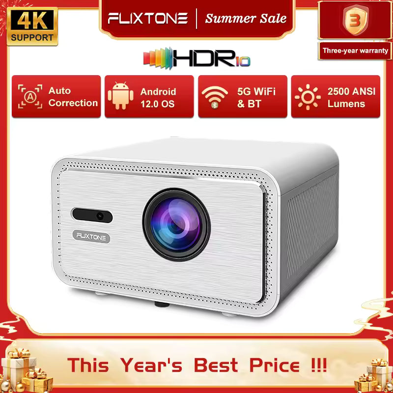 Experience high-end cinematic entertainment with the Flixtone D9W, a powerful and smart mini projector that combines 2500 ANSI lumens, native Full HD 1080P resolution, and 4K content support. With built-in Android TV, it's the perfect companion for watching films, series, sports, or presentations with quality, convenience, and style.
